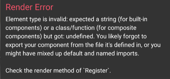 check the render method of 'Register'. 는 어디서 에러가 났는지 알려준다
